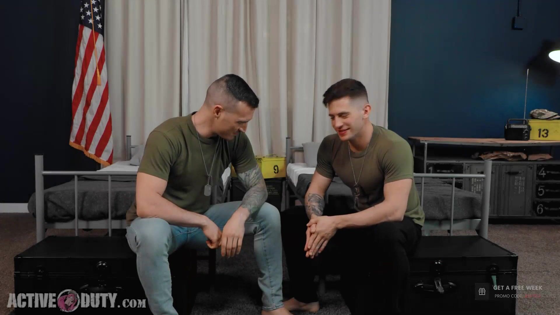 MILITARY JOCK AND HOMIE DEREK KAGE DEEPTHROAT AND POUND EACH OTHER'S HOLES IN HOT STANDING ACTION